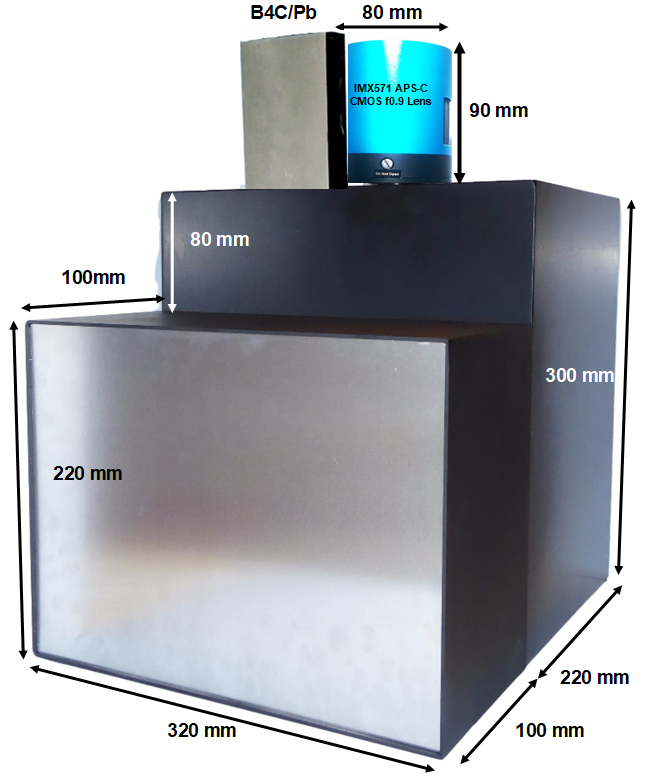 Our new standard camera is faster and has higher resolution than our old 250x200mm camera, with a larger 300x200mm FOV in a more compact case. This is achieved by using a larger APS-C CMOS detector with a brighter shorter focal length lens (f/0.95 at 25mm). It maintains the versatility of in-situ interchangeable x-ray and neutron scintillators, while keeping the price below €10K for a large camera complete with scintillator, software and everything needed for immediate operation.Extra lead or concrete gamma shielding is recommended around the detector.