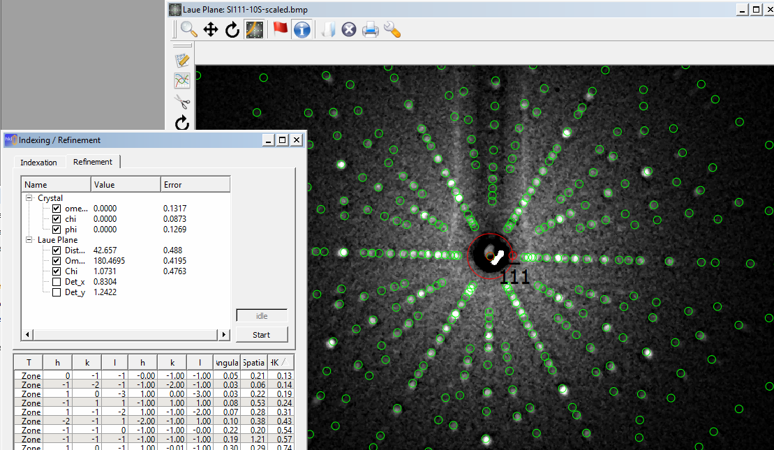 The Si pattern below was collected in only 10s by another user, and oriented and refined with CLIP (Cologne Laue Indexing Program). All spots fit well, and the calculated errors in the crystal orientation are only ~0.1 degrees. (Click the image to enlarge it).