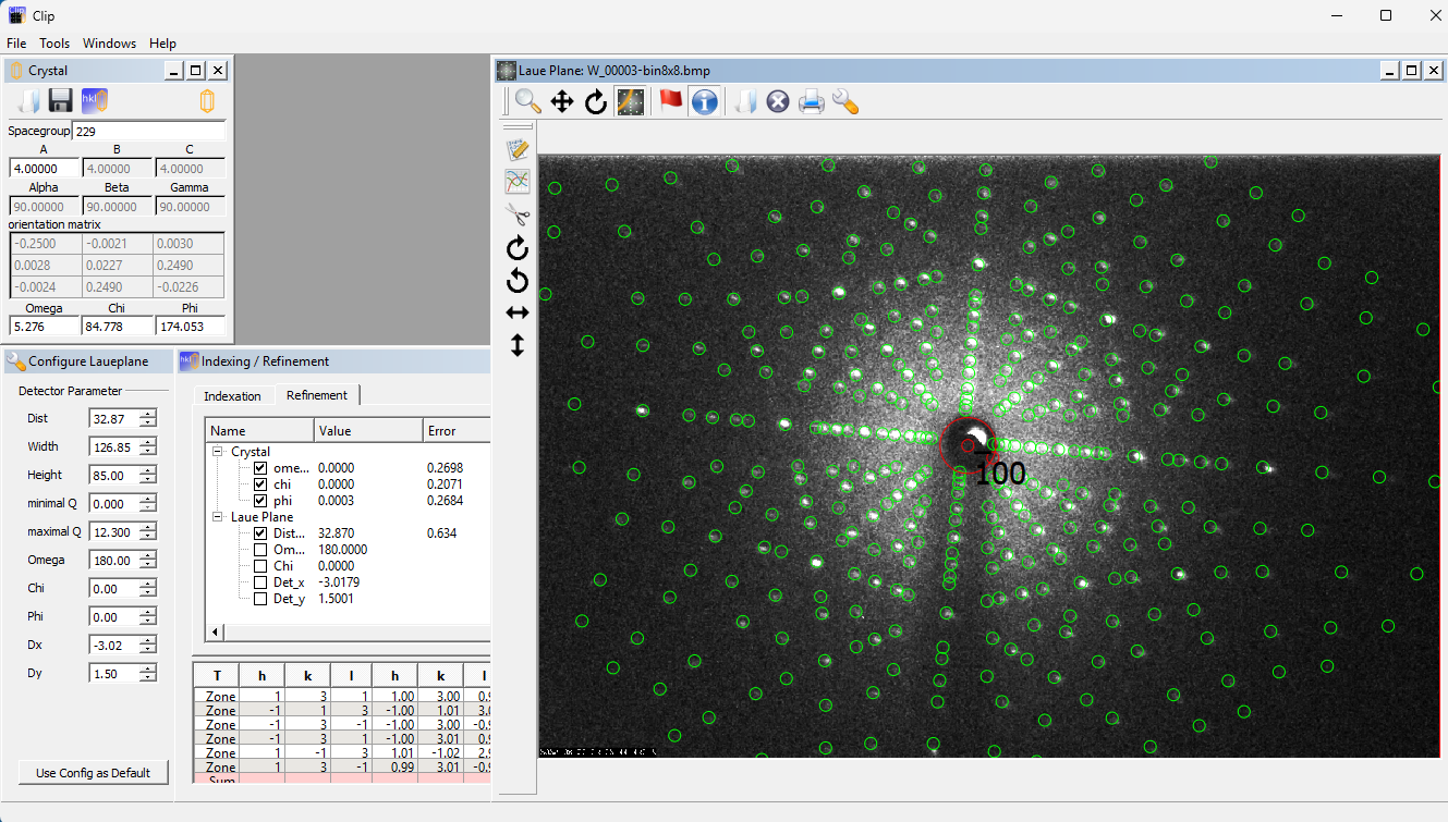 The Si pattern below was collected in only 10s by another user, and oriented and refined with CLIP (Cologne Laue Indexing Program). All spots fit well, and the calculated errors in the crystal orientation are only ~0.1 degrees. (Click the image to enlarge it).