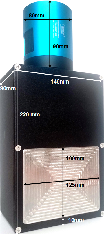 This large 1-CMOS Laue camera is designed to replace our old 2-CCD Laue camera. By using a larger APS-C 24x16mm CMOS detector instead of two 12.5x10mm CCDs, we increase the total detector area (efficiency) by over 50% allowing a slightly larger Field-Of-View (FOV) for similar exposure times (3-5 minutes). The efficiency is further improved by using a modern f/0.95 lens instead of a pair of f/1.4 lenses. The incident beam collimator (1mm/2mm) passes through a mirror and a scintillator in the centre of the camera, and the backscattered diffraction pattern is collected in real time for precise crystal orientation. This new camera with higher efficiency and simpler operation is also less expensive !The dimensions can be adjusted to order.